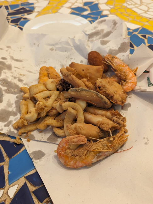 This place is known for their fried seafood and I knew I could not leave without getting some disgustingly good battered seafood. I stopped by Freiduria Marisquería Las Flores on my way back to the hostel and picked up 1/2 kg of mixed fried seafood. They have a dedicated take away section where you can simply get a ticket, wait for your number to be called, and tell them what you would like. I got lucky on my turn when they came out with new freshly fried seafood. At first I had asked for 1kg of seafood but he said that is way too much for one person (highly debatable, but I definitely can finish 1kg of food in one sitting). I told him I had a bus to catch in the afternoon and may keep some food for later, but alas I gave up trying to persuade him that I can really finish it all. You can see that there are various seafood items you can select, from prawns to calamari to dogfish.